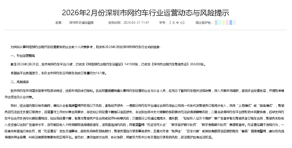 △深圳市交通运输局发布公告,提醒深圳经营网约车风险