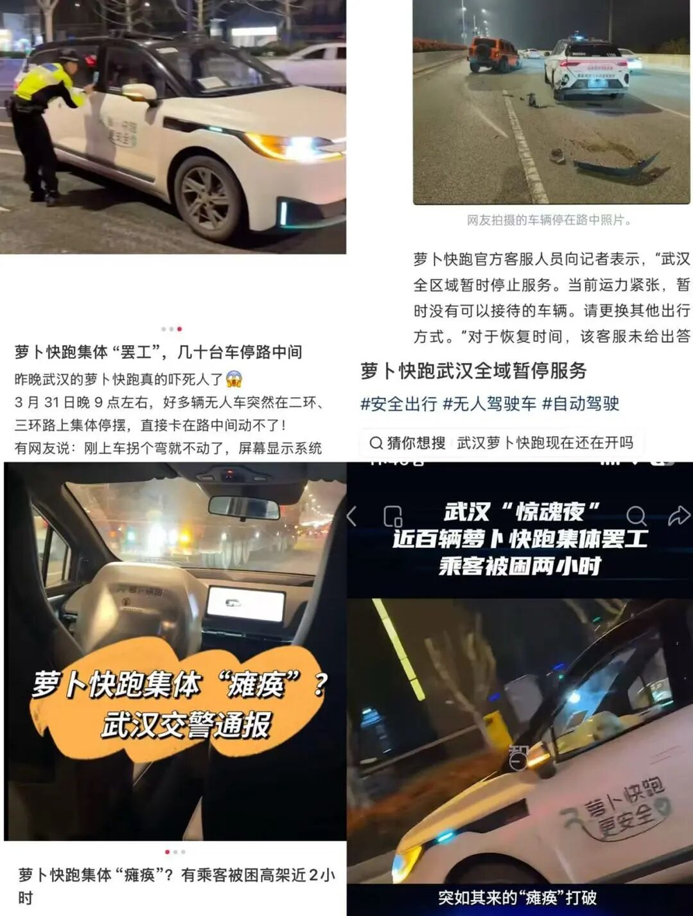 有部分乘客被困车内近两小时,这也是国内首例大规模无人驾驶车辆停摆事件。