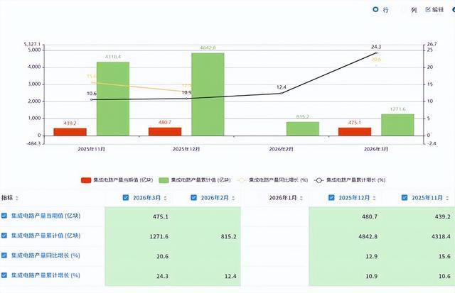 按照国家统计局的数据,2026年1~3月份,国内一共生产了芯片1271.6亿颗,增长了24.3%,计算下来是日均生产芯片14亿多颗,也是一个全新的记录。